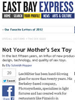East Bay ExpressSex Toy Transformation "In the last fifteen years, an influx of new producers has revolutionized the design, technology, and quality of sex toys. According to Dr. Carol Queen, who has been the resident sexologist at Good Vibrations since 1990, the first major change in sex toy style began with a simple move away from "Caucasian-equals-butterscotch"-type coloring. "The best thing you could hope for in the Eighties was pink and blue, and that was so Eighties anyway," she said. The early 1990s featured jewel tones that Queen said were "harbingers," and some new, less-phallic shapes made the products more acceptable for media coverage. "I think it was in the late Nineties when a design magazine got in touch with us [at Good Vibrations] and said, 'We're looking to showcase your most interesting designs,' and that was the first moment I can recall that anyone had said design," said Queen. "If they had waited ten years to do that issue, they would have had too many toys to choose from, but at the time there were only a small handful of interesting shapes." |